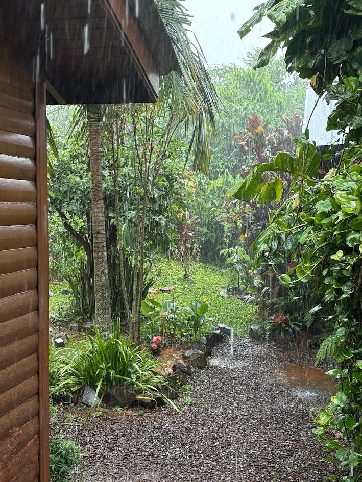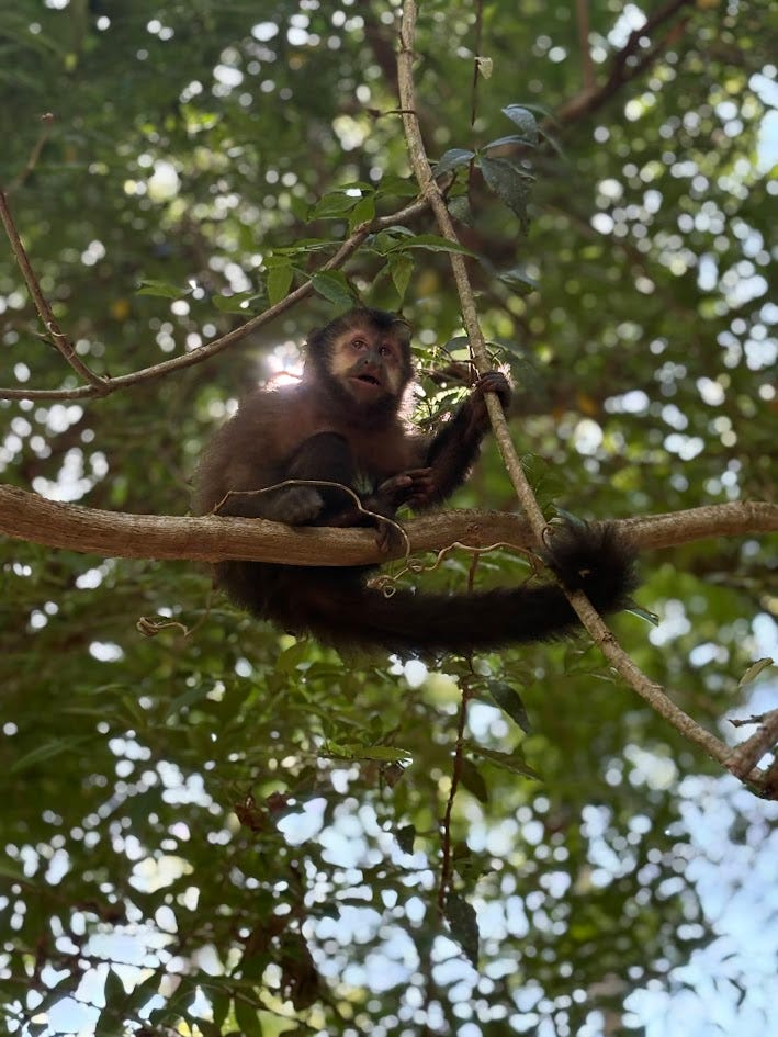 As we landed we were greeted by a cover of green. Our taxi took us through tree arches and we passed multiple signs warning of the coati crossings and potential tigre (jaguar) crossings. The cabin where we stayed was small but charming and they had created a mini jungle paradise on their property filled with palm trees, exotic looking plants, and the bonus of a swimming pool for the kids. It was already early evening so we went swimming, ordered food, and settled in for the night.